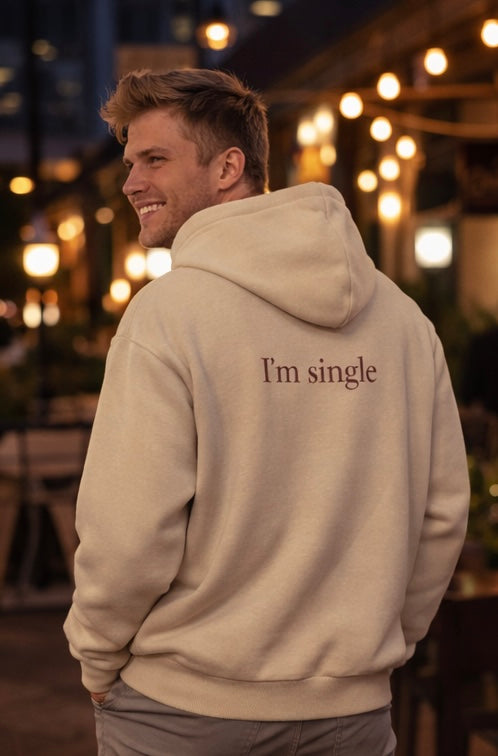 Minimalist sand unisex hoodie with a subtle I’m Single back print. Soft everyday comfort with a calm dating statement made for singles.